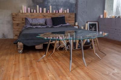 Столик изготовлен из металла, стекла и дерева. Материалы: металл - нержавеющая сталь, стекло – каленное (цвет любой), дерево – сосна крашеная (цвет любой). Эксклюзивная работа.